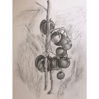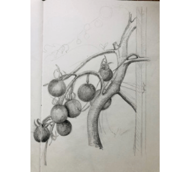 The tomatoes are ripening and the different varieties are wonderful subjects to draw and eat! Beans, salads, courgettes, potatoes, soft fruit etc are plentiful and delicious. The success of all the fruit and vegetables means plenty of time is required for picking, tending, watering, feeding and turning into jams, chutney, cakes, bread, soups, meals – our freezers are filling up!
