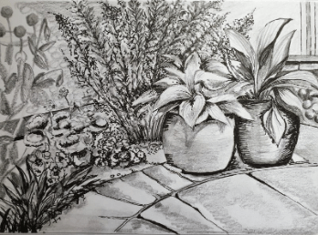 With the gradual lifting of some restrictions a few of the art group felt able to meet up this month for the first time since February. Working outside ‘en plein air’ in the Frogmoor garden and vegetable plot gave the artists ‘social distancing’ space while allowing for companionship, exchange of ideas and a renewed enthusiasm and focus.